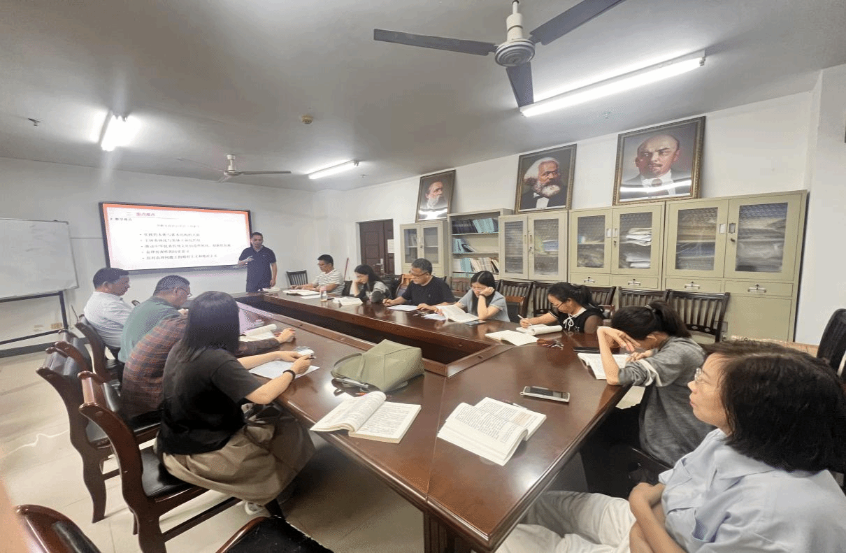 会议第二阶段,与会教师研讨。李忠、方英群等7位老师依次发言,大家就说课内容和第二章教学重难点问题展开热烈讨论。大家一致认为实践观不仅是马克思主义基本原理的核心观点,也是辩证唯物主义认识论首要的基本观点,在马克思主义理论体系中也十分重要。
