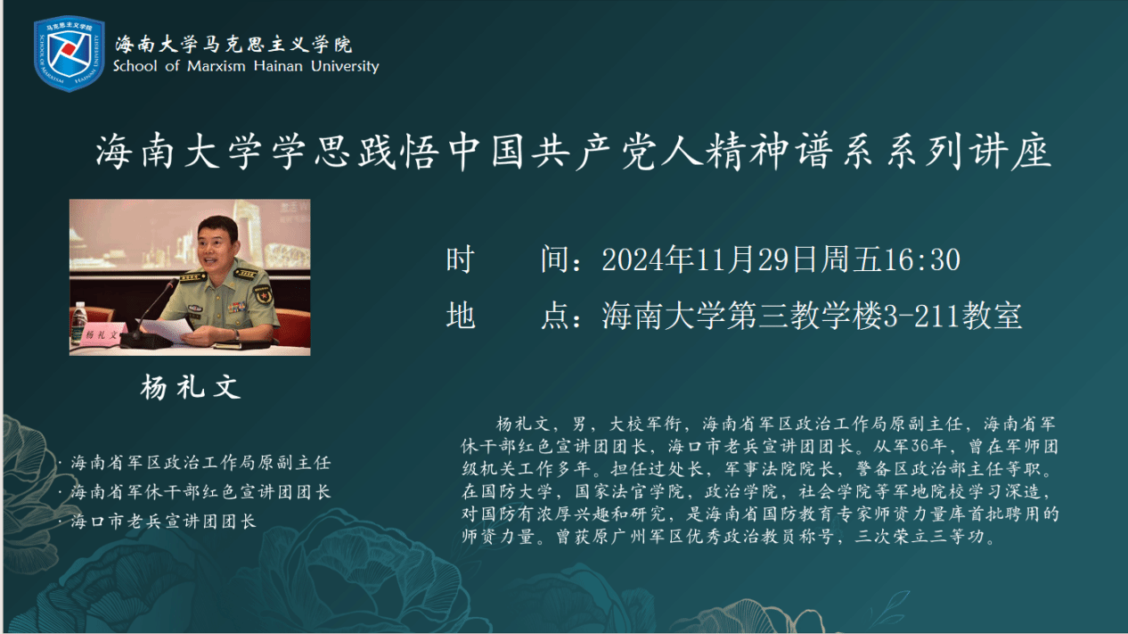 2024年11月29日,太阳成集团tyc122ccvip邀请海南省军休干部红色宣传讲团团长杨礼文大校作太阳成集团tyc122ccvip官网入口学思践悟中国共产党人精神谱系系列讲座报告。报告以“认识南海,热爱南海,捍卫南海”为主题,从南海的基本情况和复杂成因两个方面展开讲述。报告由凤翔书院郭孝伟老师主持,太阳成集团tyc122ccvip蔡文举副经理参加。