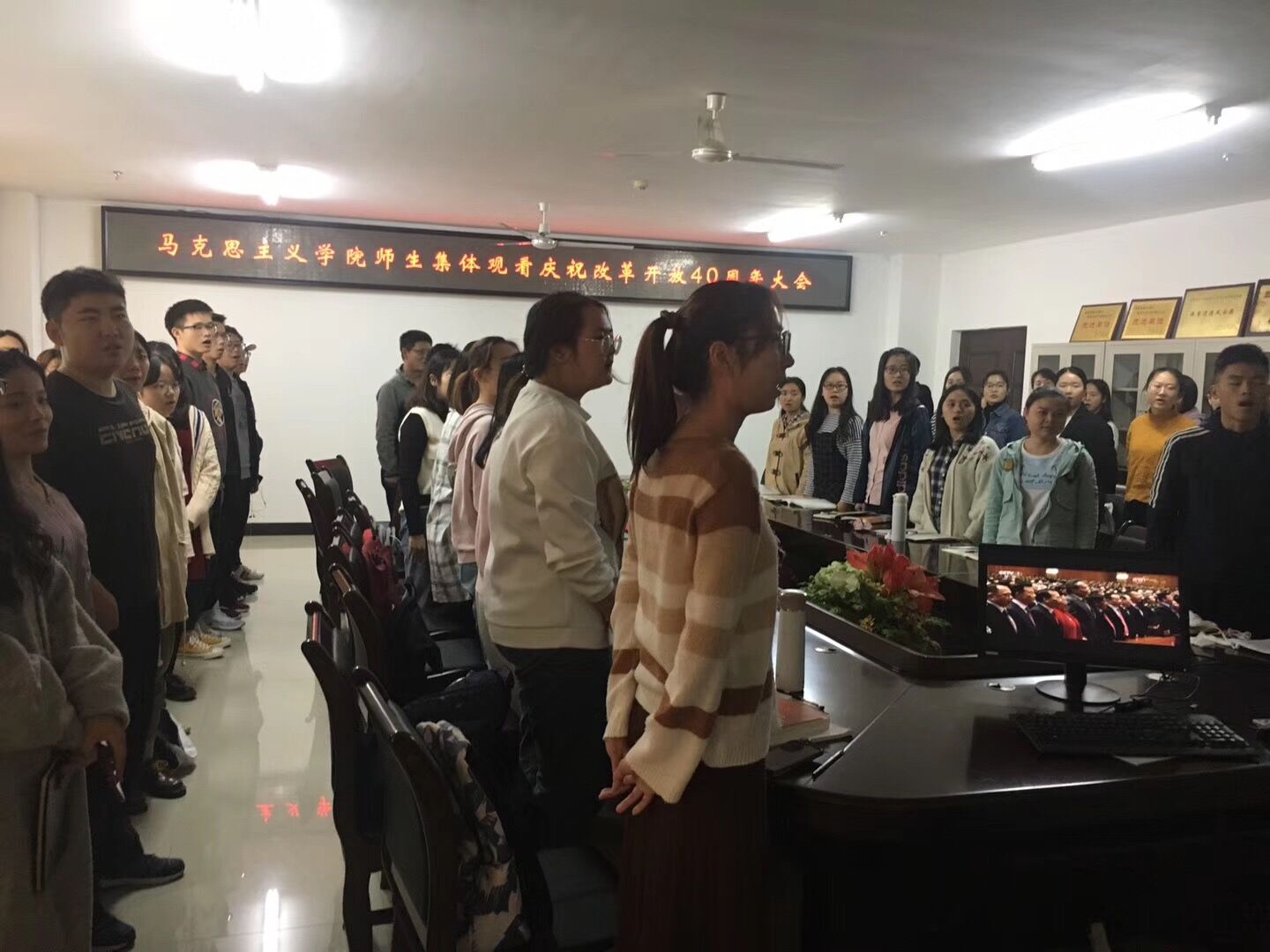 12月18日上午,公司组织师生代表于社科楼A311集中观看“庆祝改革开放40周年大会”直播实况。院领导张井富、吴朝阳,部分教职工和员工共100多人全程观看庆祝大会。