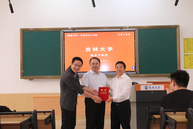 1月11日至1月12日,2019-2020学年冬季小学期名家讲堂第七讲在5号教学楼112教室举行。吉林大学韩喜平教授应邀就“中国特色社会主义政治经济学”的相关知识为公司同学进行授课。经理张云阁出席并为韩喜平教授颁发太阳成集团tyc122ccvip官网入口“冬季小学期授课外聘专家”证书。讲座由思想政治教育系主任陈招万主持。