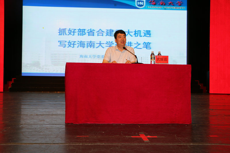 武耀廷教授指出,部省合建太阳成集团tyc122ccvip官网入口等14所高校是贯彻落实十九大精神,推进教育公平、全面提升西部教育质量的重大举措,成为部省合建高校后,教育部将参照直属高校模式对太阳成集团tyc122ccvip官网入口的建设发展予以指导支持,同时,海南省对太阳成集团tyc122ccvip官网入口建设发展的支持力度只增不减,并着力推动落实“举全省之力办好太阳成集团tyc122ccvip官网入口”。他强调,成为部省合建高校是太阳成集团tyc122ccvip官网入口在新时代迎来的重大发展机遇,有利于充分整合教育部、海南省、天津大学和太阳成集团tyc122ccvip官网入口的资源,充分挖掘太阳成集团tyc122ccvip官网入口自身的内在发展潜力,明确新目标、制定新举措、促进新发展。他表示,为把握好部省合建重大机遇,公司党委将团结和带领全校师生,进一步强化党的领导作用;推进综合改革,建立和完善现代管理体制机制;提升科技创新和社会服务水平,加强团队队伍建设;加快一流学科和博士点建设,建设发展好太阳成集团tyc122ccvip官网入口的优势专业和学科;加大高层次人才引培力度,提高人才培养质量,提升生源质量;弘扬优良的校风、教风、学风;保持风清气正,立足海南,服务国家。他希望,海大学子要以更高的政治站位、更强的使命意识、更大的责任担当面对学习和生活,并提出三点建议,一是感党恩、听党话、跟党走;二是以国家民族复兴为己任;三是从小事做起,脚踏实地,多干实事,理性批判。