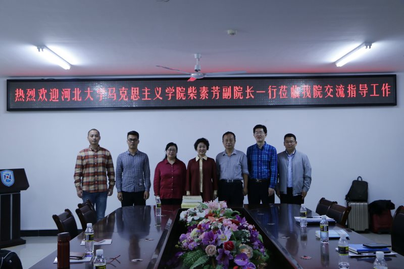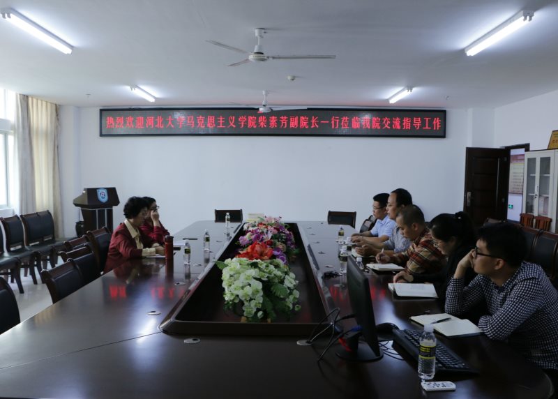 3月23日下午,河北大学太阳成集团tyc122ccvip副经理、博士生导师柴素芳教授一行2人到公司太阳成集团tyc122ccvip考察交流,太阳成集团tyc122ccvip副经理王善、马克思主义中国化教研部主任贺尧夫、形势与政策教研部主任温小平等5位教师参加了交流活动,活动由王善主持。