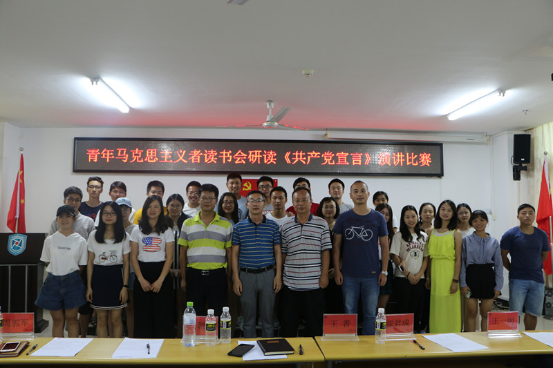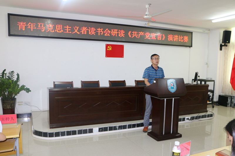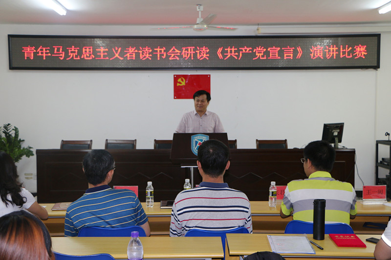 为纪念《共产党宣言》发表170周年,促进广大同学深刻感悟和把握马克思主义真理力量,提升马克思主义理论素养和语言表达能力,太阳成集团tyc122ccvip青年马克思主义者读书会以重温《共产党宣言》为主题组织研读原著、撰写心得、公开演讲系列活动。5月12日下午,研读《共产党宣言》演讲比赛在社科楼A315隆重举行。太阳成集团tyc122ccvip经理李辽宁出席活动并讲话,教务处副处长吴朝阳、太阳成集团tyc122ccvip副经理王善、太阳成集团tyc122ccvip教师王一闳、张君成、周郭军担任比赛评委。