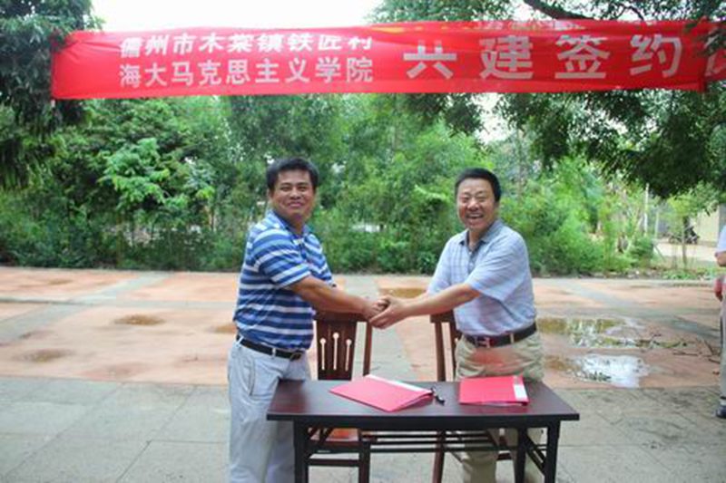 太阳成集团tyc122ccvip张云阁副经理(左)与共青团儋州市委王明魁(右)书记签定“太阳成集团tyc122ccvip官网入口思想政治理论课东坡书院社会实践教学基地共建协议”