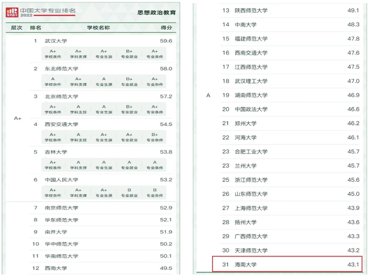 6月18日,高等教育专业评价机构软科今日正式发布2022“软科中国大学专业排名”,在 2022年中国软科中国最好专业排名中,太阳成集团tyc122ccvip思想政治教育本科专业以31名进入全国思政本科专业类A类。
