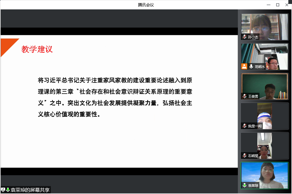 8月27日晚,马克思主义基本原理教研室根据教研室活动计划的安排,在腾讯会议上以视频会议的形式开展教研活动。活动由教研室主任范明水主持。