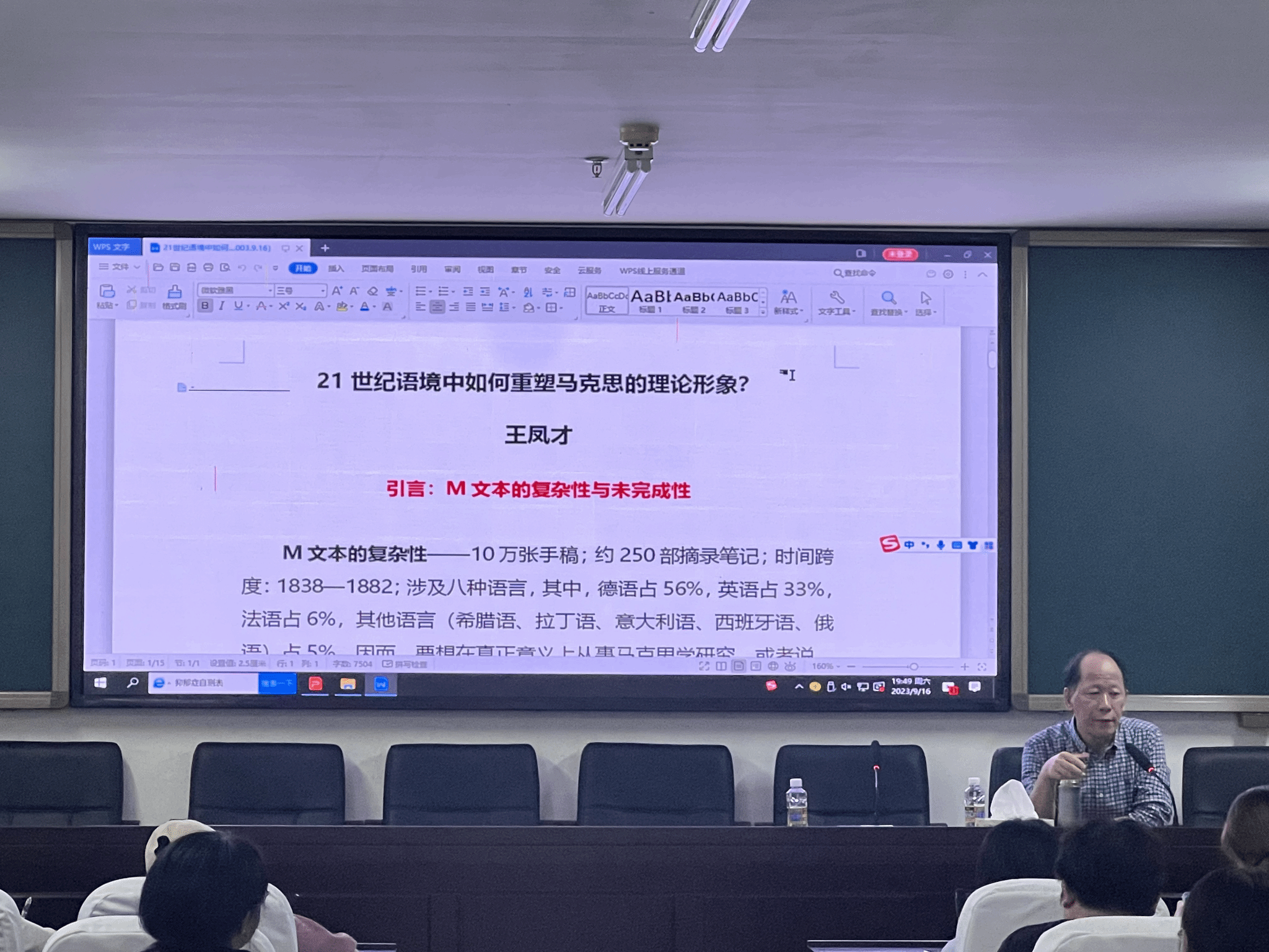 2023年9⽉16⽇晚,海南大学太阳成集团tyc122ccvip“冬季小学期系列课程”第一讲在社科楼A309会议室举⾏,复旦大学特聘教授、哲学公司与太阳成集团tyc122ccvip博士生导师王凤才教授应邀做了题为“21世纪语境中如何重塑⻢克思的理论形象”的学术报告。报告由太阳成集团tyc122ccvip黄启祥教授主持,2021级本科生以及2023级全体研究生聆听了此次报告。