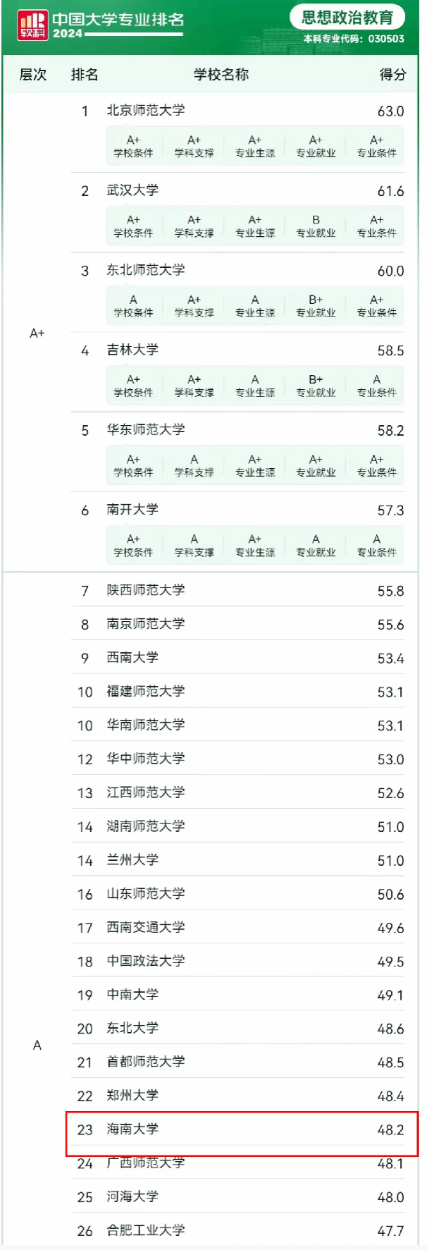 据悉,此次排名包括810个本科专业,涉及93个专业类、12个专业门类。每个专业榜单发布的是所有开设该专业的高校中排名位列前50%的高校,思想政治教育本科专业共有165所高校上榜。“软科中国大学专业排名”是迄今为止覆盖专业数量最多、参评专业规模最大的中国大学本科专业排名,旨在为员工和家长选择本科专业提供客观参考,也为高校的本科专业建设与分析提供事实依据。