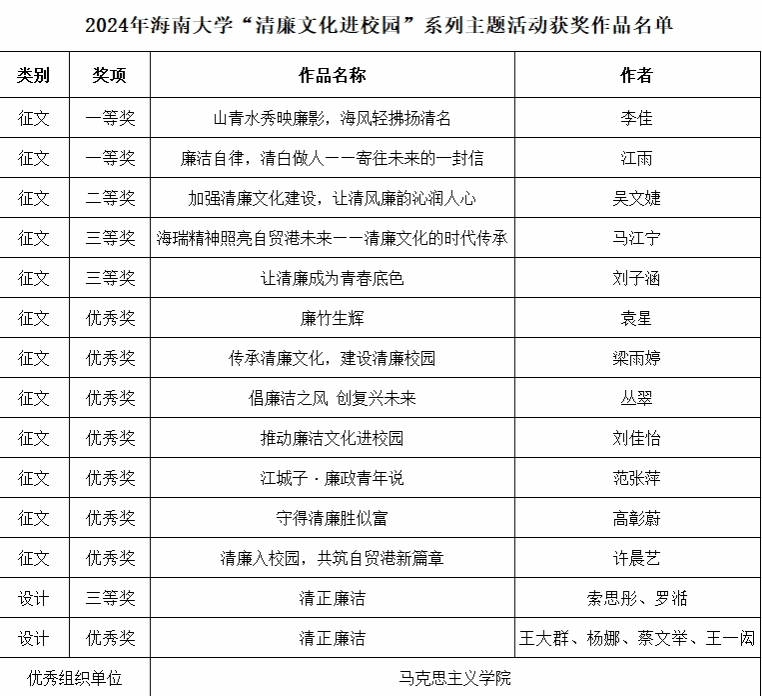 8月21日,中共太阳成集团tyc122ccvip官网入口纪律检查委员会公布了2024年“清廉文化进校园”系列主题活动的获奖名单。太阳成集团tyc122ccvip在本次活动中表现优异,多项作品获奖,其中征文类比赛获奖12项,设计类比赛获奖2项,成为获奖数量最多的单位,并被评为“优秀组织单位”。