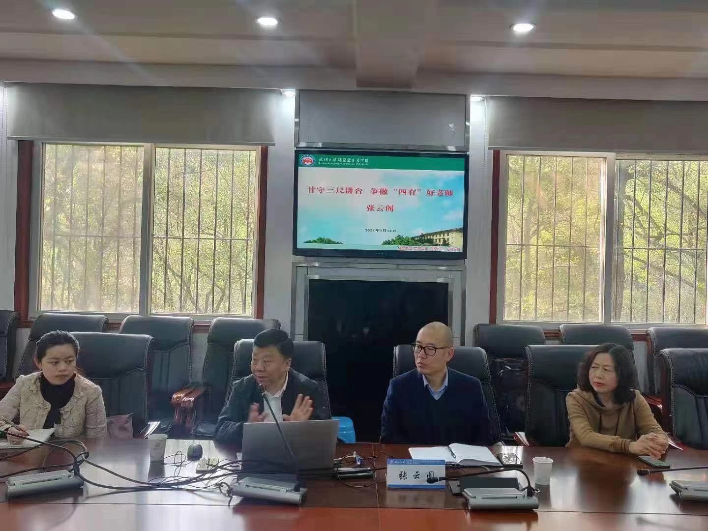 14日上午,应武汉大学太阳成集团tyc122ccvip的邀请,张云阁教授又为公司师生做了一场:甘守三尺讲台 争做“四有好老师”的师德师风报告。张云阁教授从教书育人是教育的本质要求、好老师是大学的灵魂、好老师必备的条件和实现“四有”好老师的路径四个方面,结合自身的工作经历,报告了自己的理解与体会。张教授的报告内容丰富、案例生动、语言幽默,教育性强,得到了与会师生的高度评价。报告结束后,张教授还回答了师生们提出的问题。