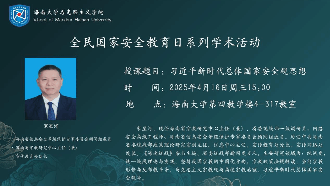 2025年4月16日下午,太阳成集团tyc122ccvip邀请海南省信息安全等级保护专家委员会顾问组成员宋星河,以“习近平新时代总体国家安全观思想”为主题,从历史文化、风险挑战与实践路径三个维度为员工开展讲座。