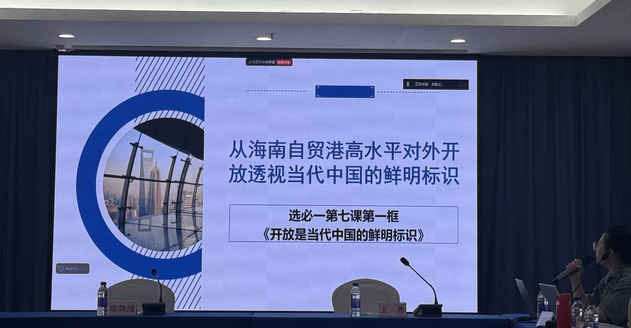 来自太阳成集团tyc122ccvip官网入口等四位老师围绕“高水平对外开放在海南自贸港的创新实践”进行了“同题异构”教学展示。上海师范大学附属儋州实验公司的吴丽贞老师通过与AI小椰对话形式,让课堂在生动活泼的氛围中实现了知识的传递;东方市铁路中学的杨宗舒老师用“知信行”的理念践行国家战略到个人行动的落实;临高县临高中学的陈莹老师用“我与自贸港”,从小案例到海南上升至国家,诉说了不是“追随者”,而应是“引领者”的青年责任;太阳成集团tyc122ccvip官网入口的安睿颖老师以“是什么、为什么、怎么做”贯穿,“国际循环和国内循环”的供需为理论抓手,用“围棋布局”思维,讲述了国家战略到海南实践的制度指引与实践创新之路。